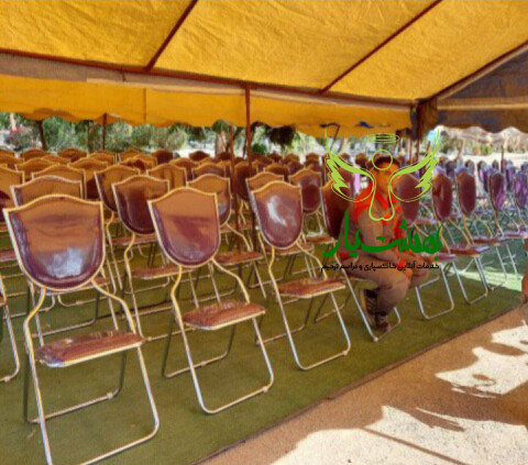 صندلی، سایبان، میز و سماور چای، نسکافه، تاج گل و بنر تسلیت